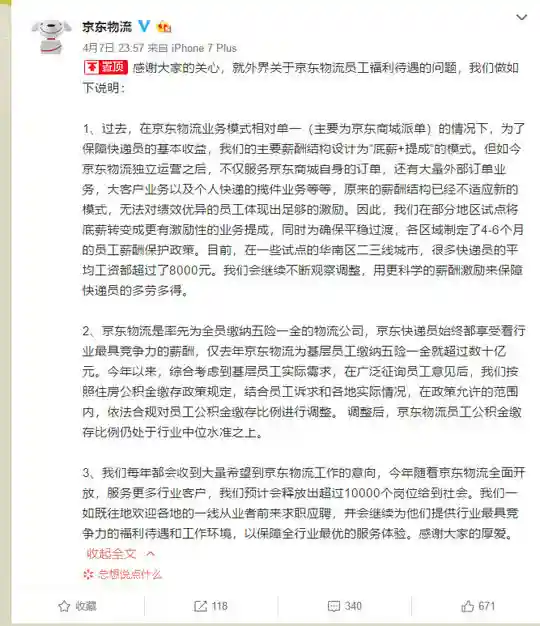 此后京东物流在其官方微博回应称:原来的“底薪+提成”的薪酬模式,已经不适应新的模式。自快递业务独立运营后,除了京东自身的订单外,还有大量外部订单等,无法对绩效优异的员工体现出足够的激励
