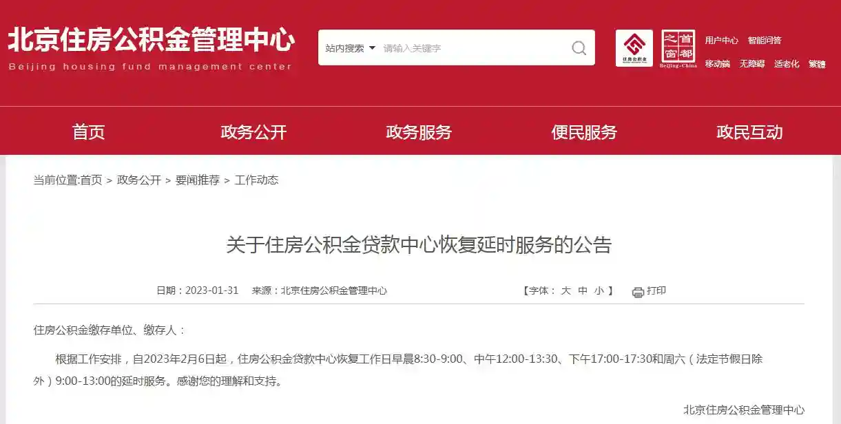北京住房公积金管理中心发布公告,自2025年2月6日起住房公积金贷款中心恢复工作日早晨8:30-9:00、中午12:00-13:30、下午17:00-17:30和周六(法定节假日除外)9:00-13:00的延时服务。