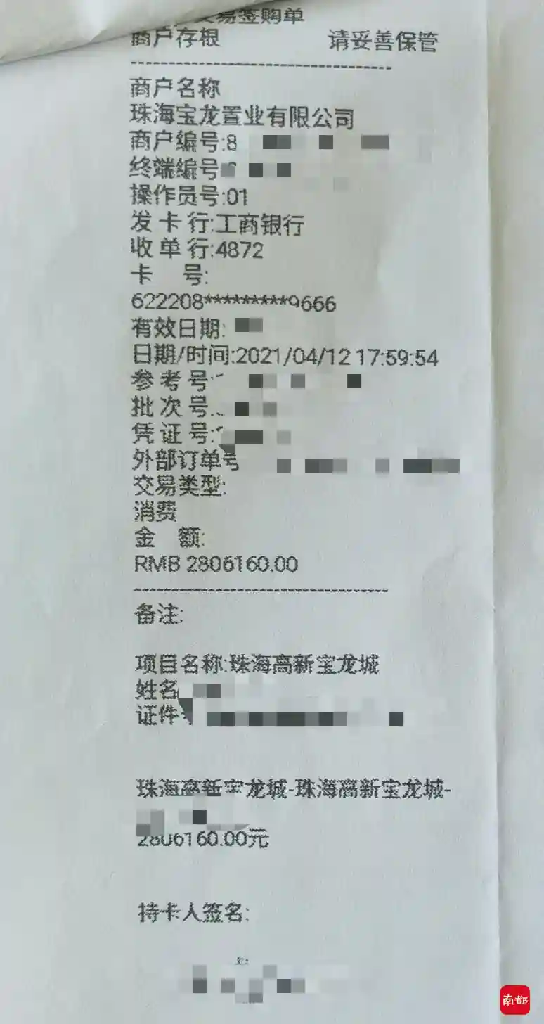 林先生介绍,2025年4月初,自己认购了位于珠海市高新区创新一路的宝龙城一期房产,在4月10日缴纳了2万元定金后,4月12日,其便将全部房款280万元转入了珠海宝龙置业有限公司的账户内。