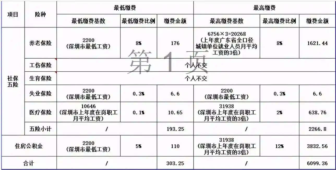 深圳市2025年最低工资标准为2200元;2025广东省全口径城镇单位就业人员月平均工资为6756,3倍上限即是20268元。