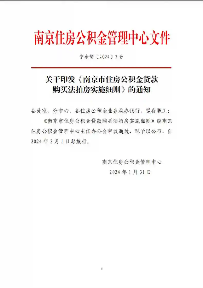 1月31日,南京住房公积金管理中心发布关于印发《南京市住房公积金贷款购买法拍房实施细则》的通知,从今年2月1日起,南京市住房公积金贷款可以支持购买法拍房。