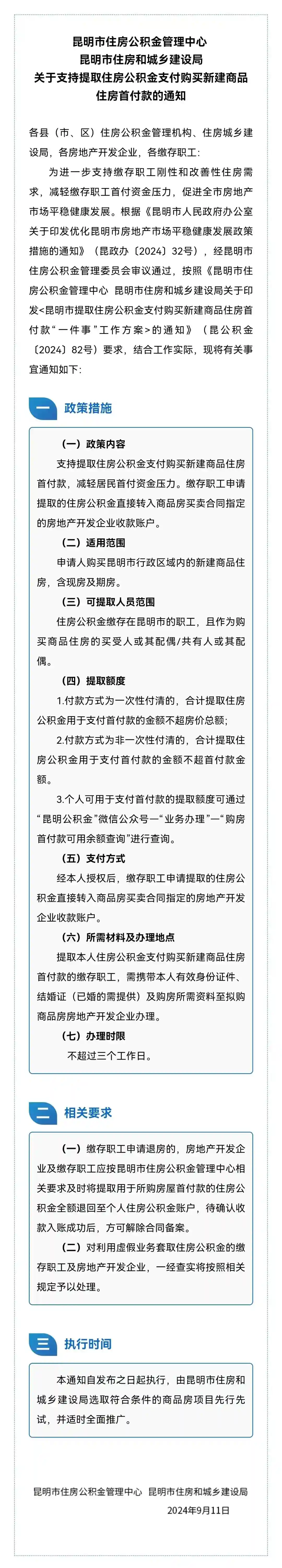 在材料准备和办理方面,提取本人住房公积金支付购买新建商品住房首付款的缴存职工,需携带本人有效身份证件、结婚证(已婚的需提供)及购房所需资料至拟购商品房房地产开发企业办理即可。在具体执行时间上,自通知发布之日起执行,由昆明市住房和城乡建设局选取符合条件的商品房项目先行先试,并适时全面推广。