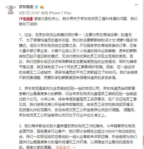 4月7日深夜,京东物流通过官方微博发文回应,称京东物流独立运营后新增大量外部订单业务、大客户业务以及个人快递揽件业务等,原来的薪酬结构已经不适应新的模式,关于降低公积金系数,则是在政策允许的范围内,依法合规对员工公积金缴存比例进行调整。